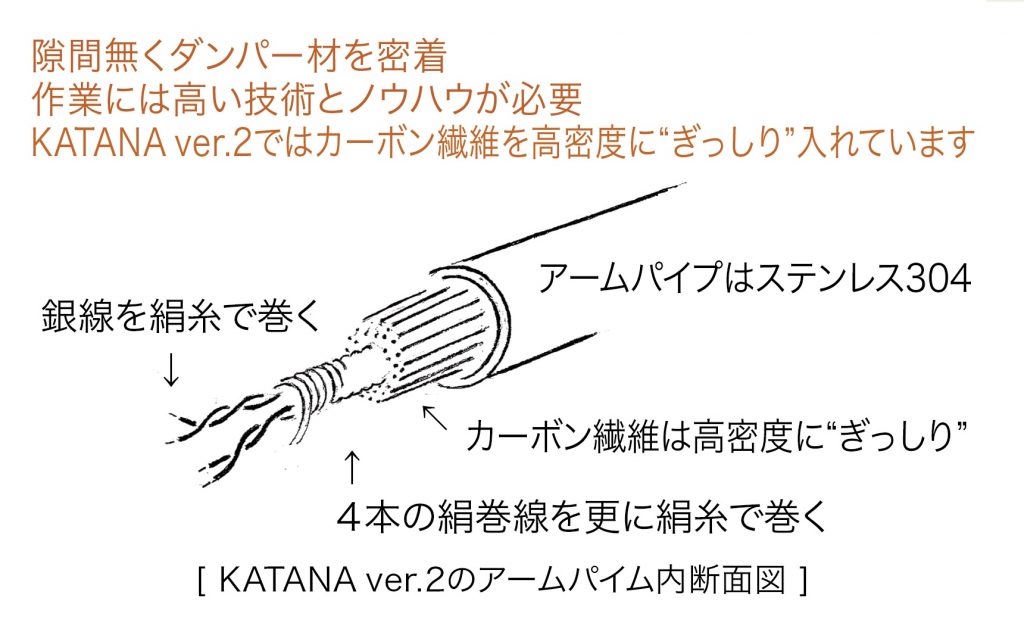 ●低抵抗の銀線を絹糸で巻き、その絹巻線4本を束ねながら更に絹糸で巻きます。それをカーボン繊維で包みアープパイプ内に入れますが、この作業には高い技術とノウハウを要します。これにより銀線側の歪み音とアームパイプ側の歪み音を両側から防振し、より原音に近づけています。
